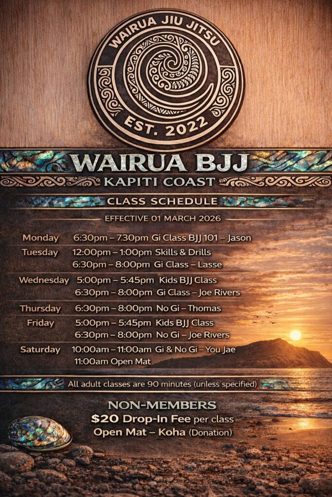 | Evening | Gi Class (BJJ 101) 6:30–8:00pm (Jason) | Gi Class 6:30–8:00pm (Lasse) | Kids Class 5:00–5:45pm / Gi Class 6:30–8:00pm (Prof Joe Rivers) | NoGi Class 6:30–8:00pm (Prof Thomas) | Kids Class 5:00–5:45pm / NoGi Class 6:30–8:00pm (Prof Joe Rivers) |